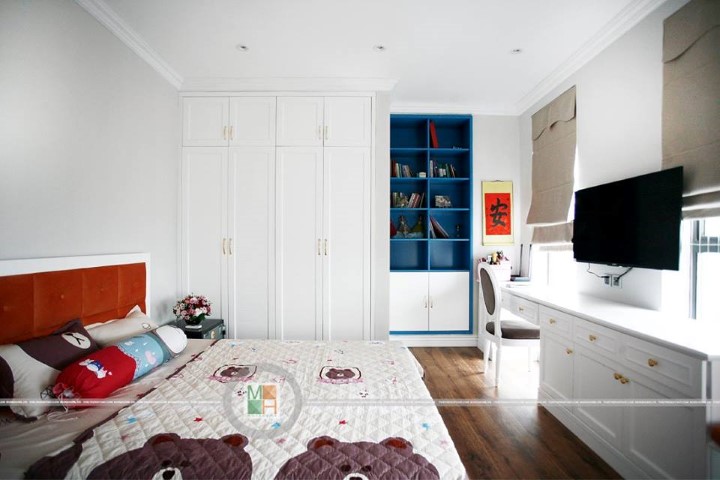 Trên đây là không gian phòng trẻ em được thiết kế và thi công nội thất khá đẹp mắt. Kết hợp từ phong cách thiết kế đậm truyền thống đến không gian nội thất hiện đại nhưng lại pha chút vẻ đẹp tân cổ điển châu Âu. Hay ý tưởng sáo tạo trong thiết kế tủ đựng đồ kéo dài thành một chiếc bàn học tiện lợi.