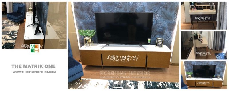 Kệ tủ tivi gỗ công nghiệp hiện đại với mặt đá trắng là một yếu tố tô điểm trang trí cho không gian.